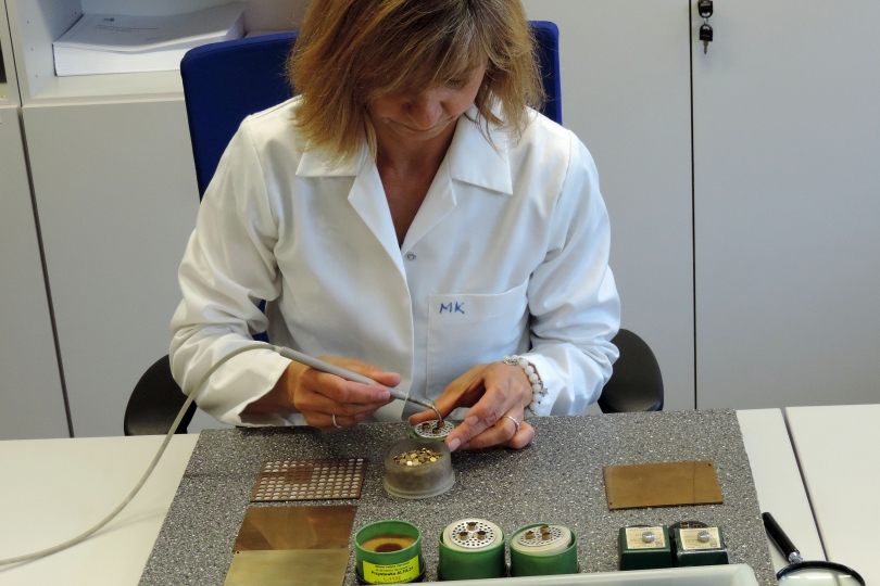 Специализированные организации технической поддержки оказывают услуги по калибровке и поверке измерительных приборов для замера уровня облучения людей и рабочих мест. Регулирующие органы и отраслевые предприятия, такие как угольные шахты, могут обращаться в эти учреждения за экспертными рекомендациями и услугами для обеспечения радиационной безопасности. На этой фотографии специалист из Польши готовит для анализа образец, отобранный на рабочем месте.