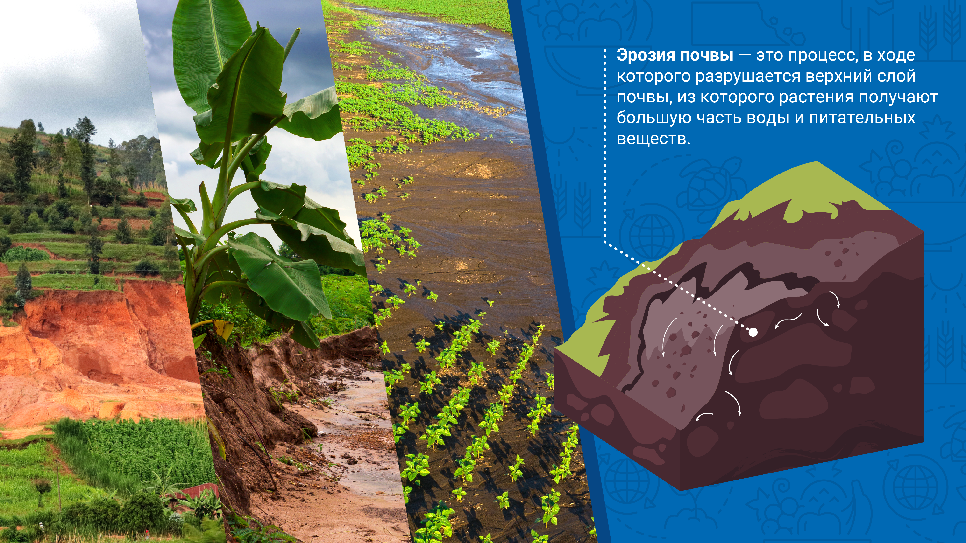 Эрозия почвы — это процесс, в ходе которого разрушается верхний слой почвы, из которого растения получают наибольшее количество питательных веществ и воды. Это самый распространенный вид деградации земель. Когда плодородный верхний слой почвы смещается, продуктивность земли снижается, а фермеры теряют жизненно важный ресурс для выращивания продуктов питания.