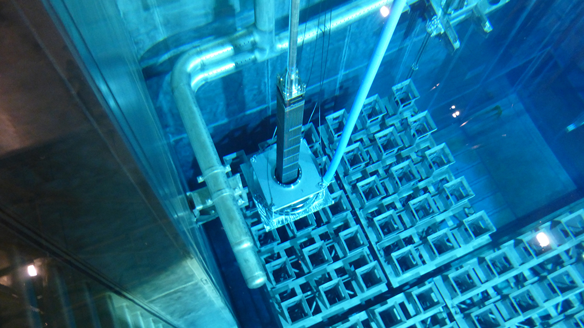 A submerged spent nuclear fuel assembly is analyzed by the Passive Gamma Emission Tomography system in a spent fuel pool. (Photo: IAEA)