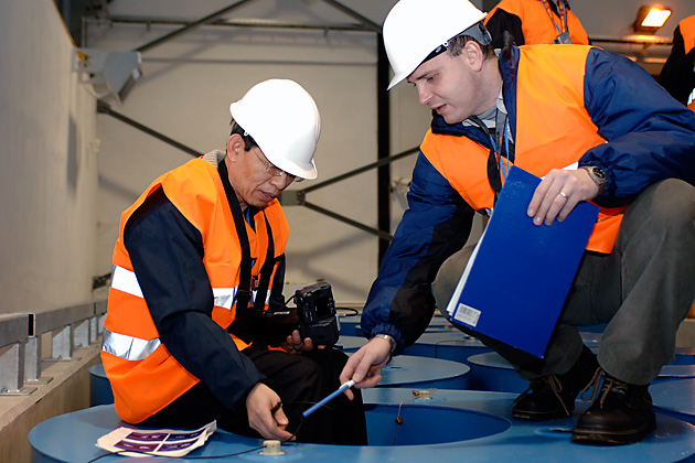 23:00 hours: IAEA Safeguards Inspector Jeong verifies seals that were earlier applied by his inspector colleagues who monitored the loading of the fuel. Czech national inspector Adam Pavlik overviews the process.
