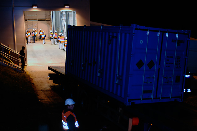 03:00 hours: Experts of a Czech transportation company specialized in handling hazardous material secure the casks with anchors.