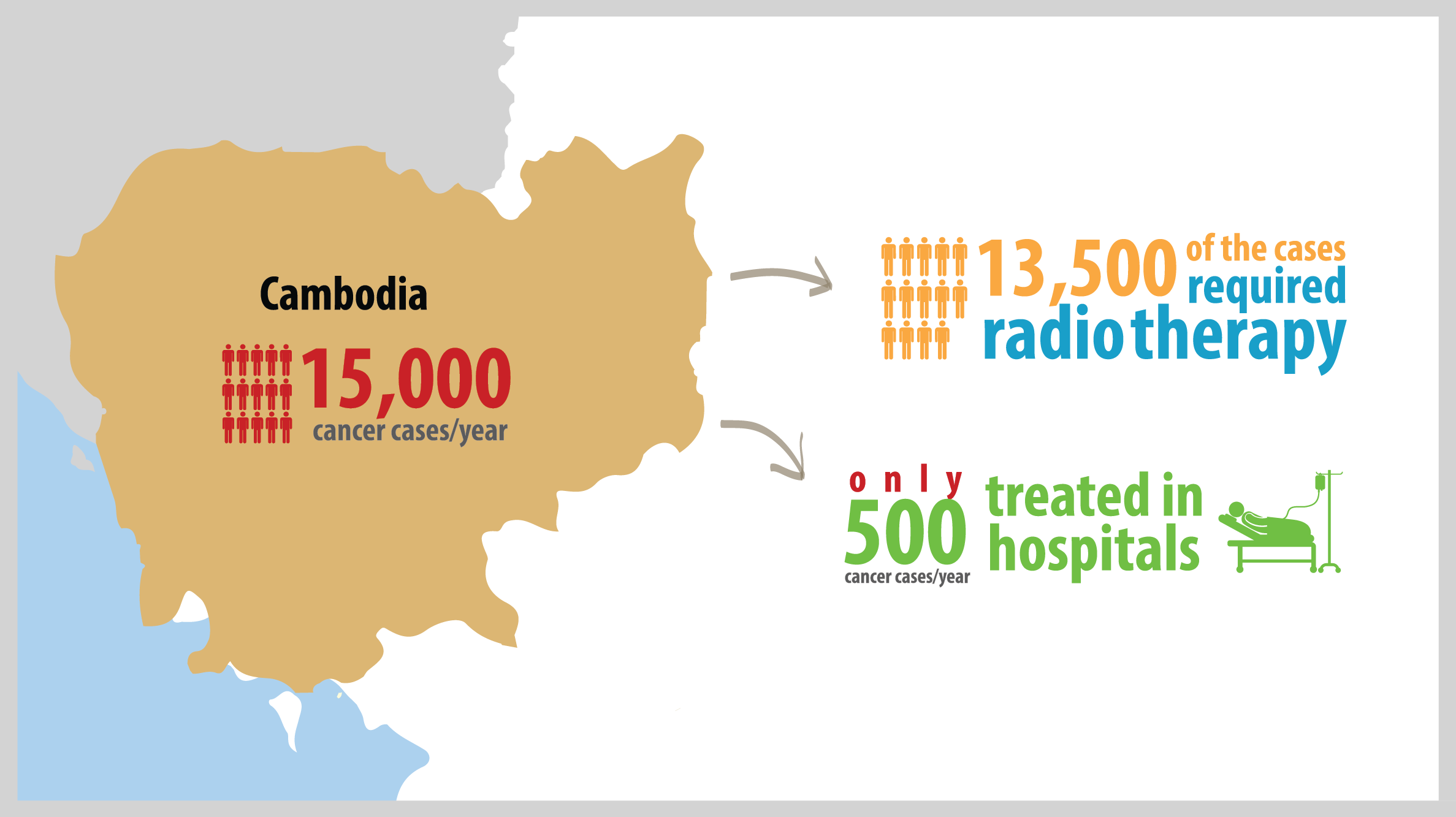 與許多發展中國家一樣,癌癥在柬埔寨是一個日益嚴重的問題。 由于生活水平提高和預期壽命迅速增加帶來的生活習慣改變,癌癥正成為該國人口死亡的主要原因之一。 雖然柬埔寨沒有進行國家癌癥登記,但估計在1500萬人口中每年約有1.5萬個癌癥病例。 這些患者中約90%需要某種形式的放射治療,但柬埔寨柬蘇友誼醫院惟一一臺放射治療機每年僅能治療約500人。 約有1500名患者能承擔到鄰國接受治療的費用,其余絕大多數癌癥患者得不到放射治療。