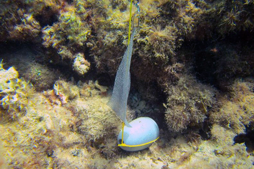 Close up of deployed window screen artificial substrate for collection of benthic (ocean floor dwelling) harmful algal bloom (HAB) species.