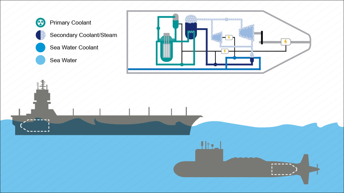 Nuclear reactors are basically heat engines. As uranium fissions, the breaking apart of atoms releases energy, much of it in the form of heat, which can then be used to do work. In a nuclear-powered vessel (submarine or surface ship), reactor heat produces steam to drive turbines that provide vessels actual power.