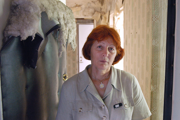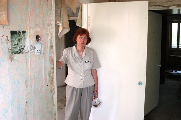 Dr. Katerina Ganzha, a former resident of Pripyat, stands in the doorway of what was once her apartment. The day after the accident she, like all her neighbors, was evacuated. The residents were told to take with them their documents and money and believed they would be back soon. None of them ever returned.