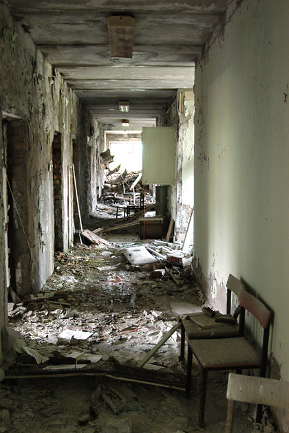 Debris and crumbling plaster are all that remain of the ground floor of the Pripyat Polyclinic. Marauders have pillaged the furniture and equipment.