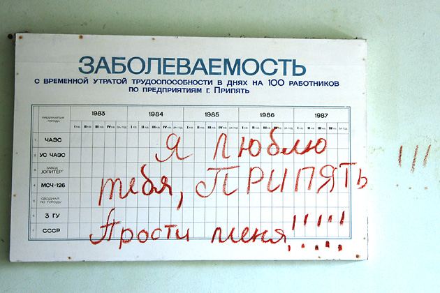 An anonymous note, written in haste on the information board in the Pripyat polyclinic reads: 'I LOVE YOU PRIPYAT, FORGIVE ME'.