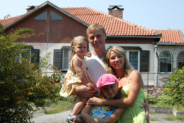 Alexej and Tatjana Rjabushkin with their daughters Nastja and Masha, pose in front of Tatnjana's parents house in Slavutich. Masha, the youngest was born in Slavutich. Alexej, a manager at the Chernobyl power plant is hopeful of his future and thinks there is enough to do for another 10 to 15 years.