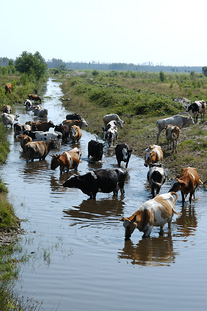 Efforts continue to revitalize the land around Chernobyl. Water drainage trenches like this one removes excess water from the peaty soil as a first step. The next step is to diminish the content of radionuclides in the soil by ploughing and introducing mineral fertilizers. Caesium and potassium are chemical twins. Hungry for minerals, a plant will pull out caesium from the contaminated soil but if potassium is in good supply the plant prefers mineral fertilizer.