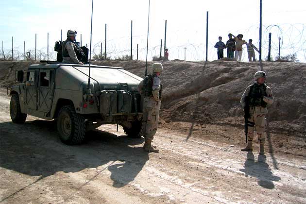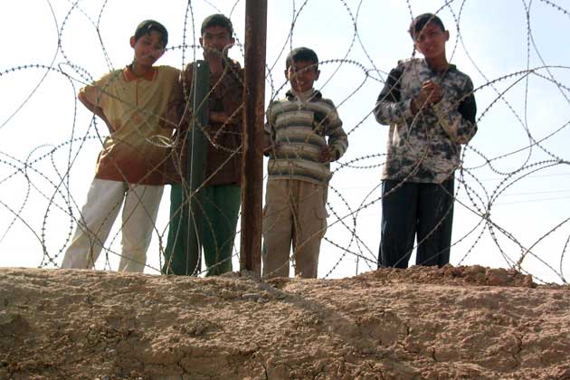 The curious children watch through barbed-wire fence as American military personnel prepare to survey the site.