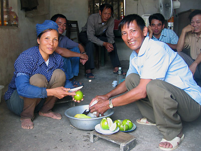 Mr. Pham Van Diep and his wife, Pham Thi Quang, host visitors with homegrown grapefruit and oranges at their family farm in Thanh Gia village, in Bac Ninh Province near Hanoi in Vietnam. The village is home to about 400 families whose livelihood is bound to rice and farming the earth.