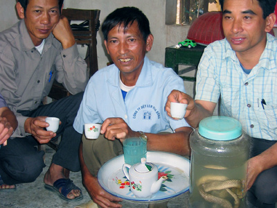 Photo 4 of 15 : Vietnam’s rice farmers are fond of a traditional drink they call ruou ran or snakewine. It’s an eye-popping rice liquor spiked with fruit, herbs, and a gutted cobra. Mr. Pham Van Diep toasts the harvest at home in his village of Thanh Gia, Bac Ninh Province, near Hanoi.