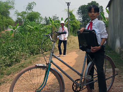 Photo 5 of 15 : School comes first for children in Thanh Gia, a small rice farming village in Bac Ninh Province outside Hanoi in north Vietnam. Along the pathway home, a young boy dressed in the school colours proudly shows his bicycle and briefcase.