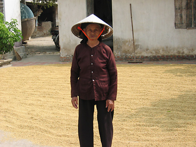 Photo 8 of 15 : A grandmother in north Vietnam's Thanh Gia village stands on a carpet of rice left to dry in her courtyard. Families have farmed rice in the country's rich Red River delta for millennia, since 2000 BC. On that time scale, Thanh Gia's families are among Vietnam's youngest rice farmers, having worked the fields for a mere 300 years.