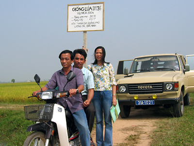 Photo 10 of 15 : Motorbikes are prized in rice farming villages like Thanh Gia in north Vietnam's Bac Ninh Province. Village leader Mr. Trinh Van Thanh gets set to take visitors for a spin, in this case Mr. To Anh Tuan and Dr. Nguyen Thi Vinh of the country’s Institute of Agricultural Genetics in Hanoi.