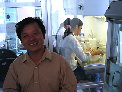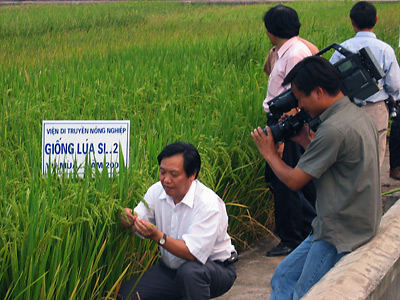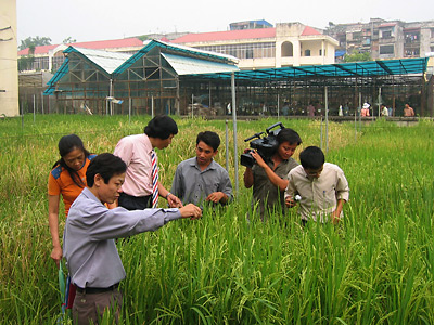 Photo 12 of 15 : A national television crew films Dr. Tran Duy Quy, who directs Vietnam's Agricultural Genetics Institute in Hanoi, the centre of rice breeding in north Vietnam. Farmers are seeing better harvests from new varieties of rice that Dr. Quy (pronounced Kwee) and his team of scientists have developed with the IAEA's technical support.