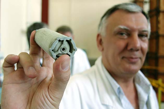 This is what the fuel elements look like. But they contain a lethal radioactive cocktail of plutonium and high enriched uranium wastes. The fuel pictured can be held because it is 'fresh'. It was never used to power the reactor so it is barely radioactive.