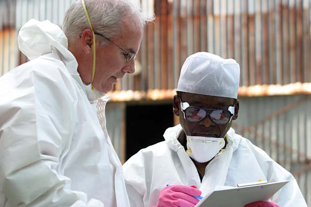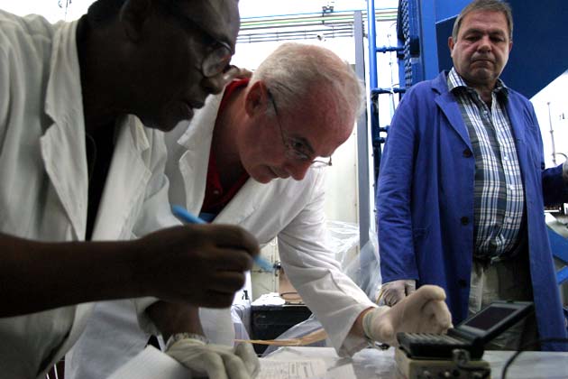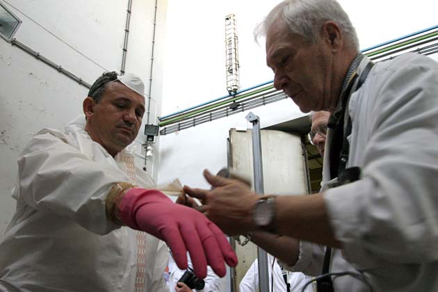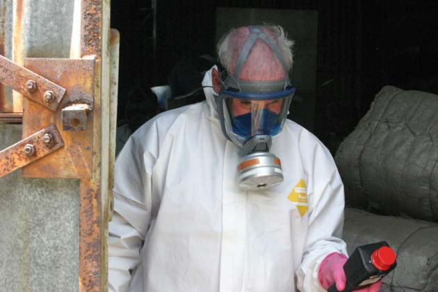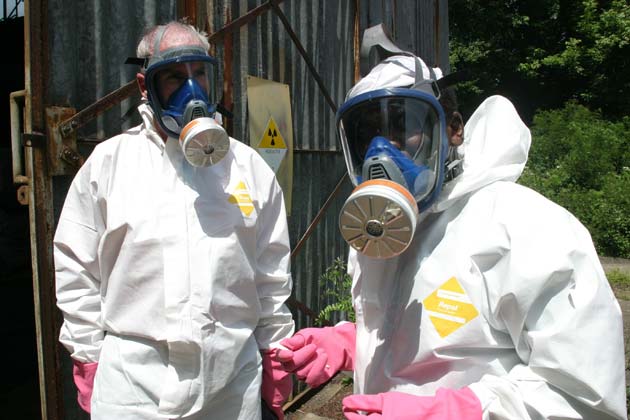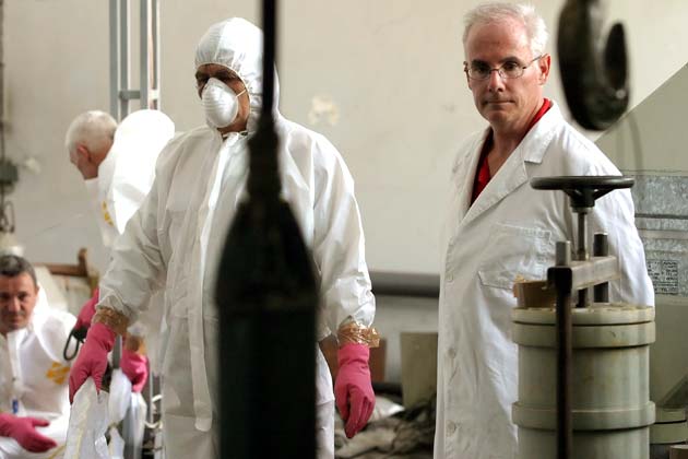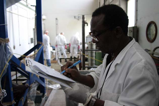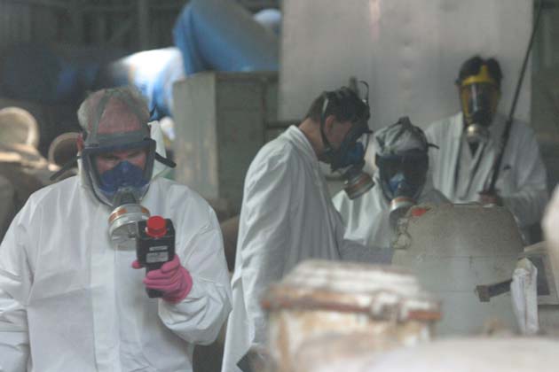 IAEA inspectors take samples of some materials inside. Part of the problem is not knowing exactly what kind of radioactive material is inside the hangars.