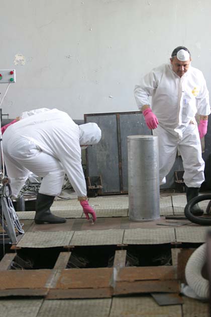 Serbian staff lift covers to access the spent fuel pond. The nuclear waste simmers in the murky water beneath where it has been cooling for the past three decades. Serbia's mission: to get rid of it, for safety and security reasons.